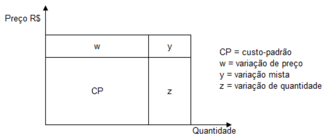 Uma indústria produz apenas um produto e utiliza apenas uma matéria-prima em sua fabricação. A equipe de Contabilidade Gerencial efetua mensalmente uma confrontação entre o custo real e o custo padrão. A análise da variação (desvio) ocorrida entre o custo padrão e o custo real da matéria-prima é parte relevante do controle de custos. A análise da variação é feita seguindo os parâmetros ilustrados na figura a seguir.
